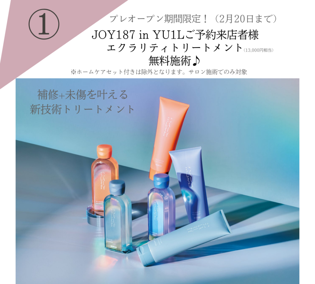 対象: 期間中に「JOY187 in YU1L」へご予約・ご来店いただいた方